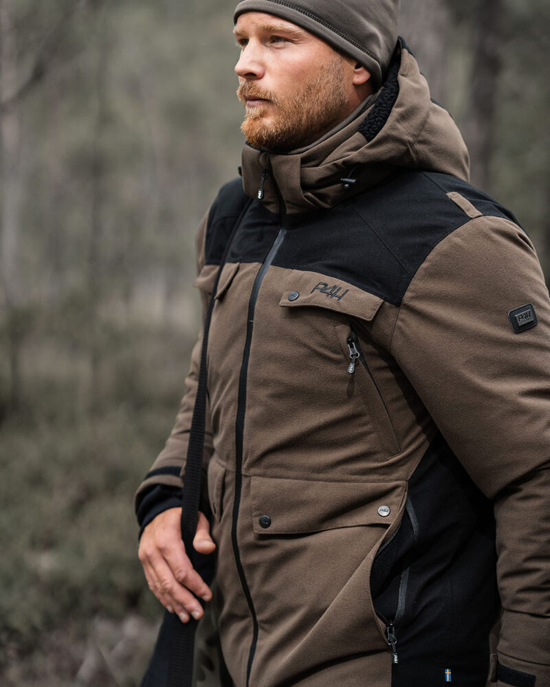 Varm jacka som är dunfodrad och vattentät. Detta är en jacka för dig som verkligen inte vill frysa. Utsida i tyst och mjuk ” Hunting velvet ”, laminerad med ”Super high membrane”