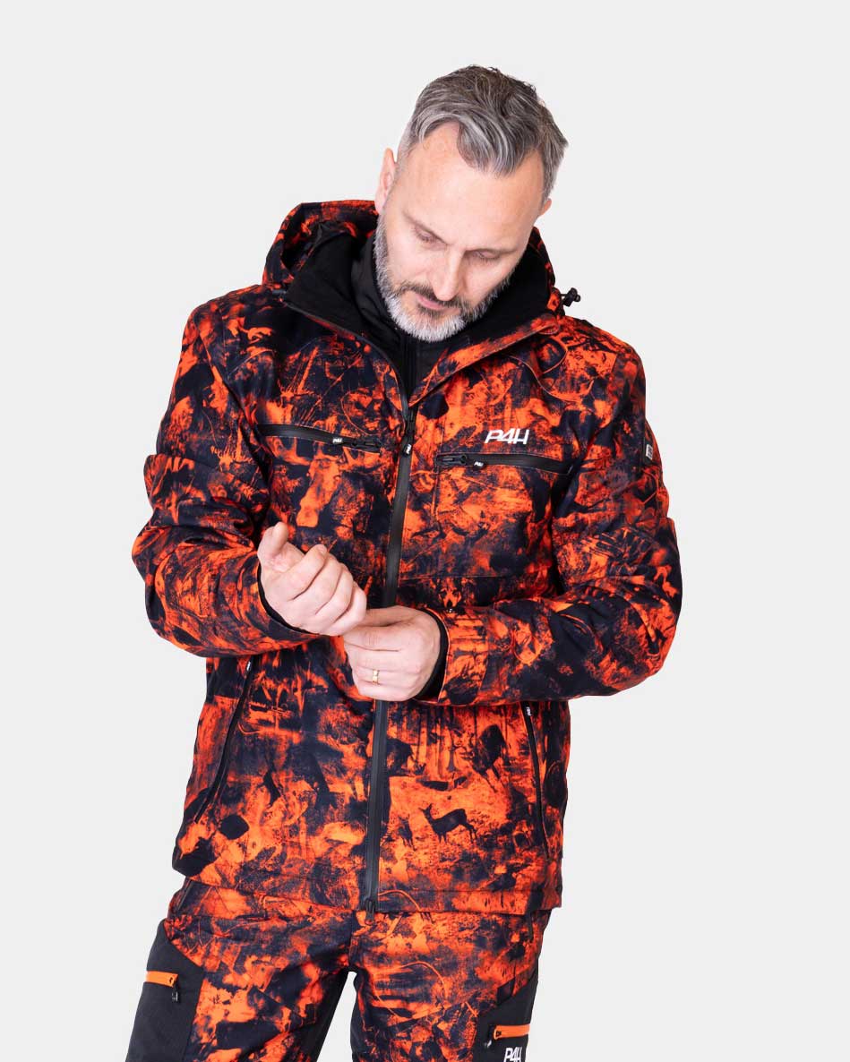 Jaktställ för hundförare och passkytt. Hunters Elite orange camo är ett vattentätt jaktställ och är våran absoluta toppmodell när det gäller funktion. Ett tyst jaktställ för den som verkligen vill ha det lilla extra. Vårt unika camouflage gör dig synlig för dina jaktkamrater med osynlig för viltet.